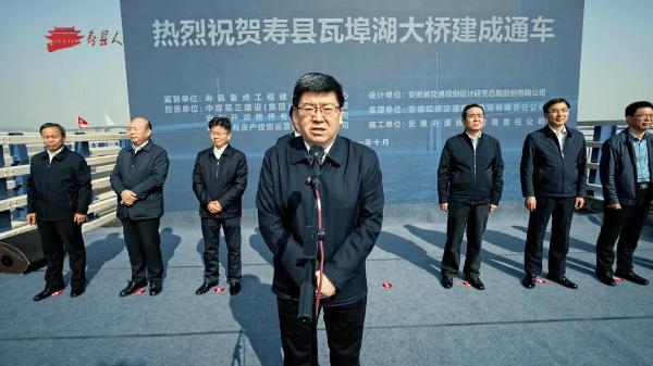“一桥横跨东西,天堑变通途”,10月23日上午,市委书记任泽锋宣布寿县瓦埠湖大桥正式通车!市领导张孝成、汪谦慎、胡东辉、沈斌、陈永多、夏智明,中煤三建集团董事长郑玉建出席开通仪式,寿县县委书记牛方括致辞,县长孙奇志主持开通仪式。