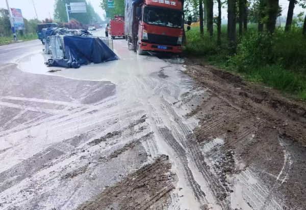 险情就是命令,处置刻不容缓。凤台分中心立即启动公路突发事件应急处置预案,迅速抽调应急抢险队伍,携带防滑料、高压洒水车、铁锹等应急设备火速赶赴现场。同时,安排专人在事故路段两端设置警示标志、警戒带,引导过往车辆减速慢行、有序绕行,有效防范二次事故发生,为现场处置争取宝贵时间。