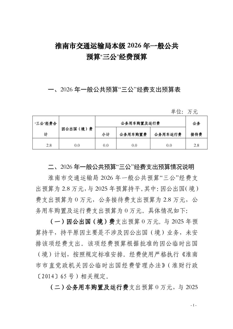 淮南市交通运输局本级2026年一般公共预算“三公”经费预算