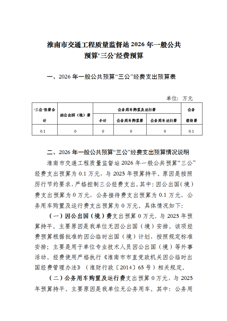 淮南市交通工程质量监督站2026年一般公共预算“三公”经费预算
